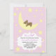 Um convite de chá de fraldas bonito com um ursinho de pelúcia descansando sobre a lua cercada por estrelas.