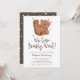 Chá de fraldas com tema de ursos bonitos com ilustração pintada manualmente de um filhote com arco e corações cor-de-rosa. O texto diz "podemos esperar muito!" Este convite é excelente para o chá de fraldas de uma garota.