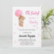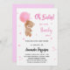 Para um chá de fraldas celebrando uma menina. Um fundo branco, com estrelas rosa. Um ursinho de pelúcia segurando um balão rosa. Personalize e adicione o nome da mãe a ser e os detalhes da festa. Querida! e Barly são escritas com um estilo escrito à mão.