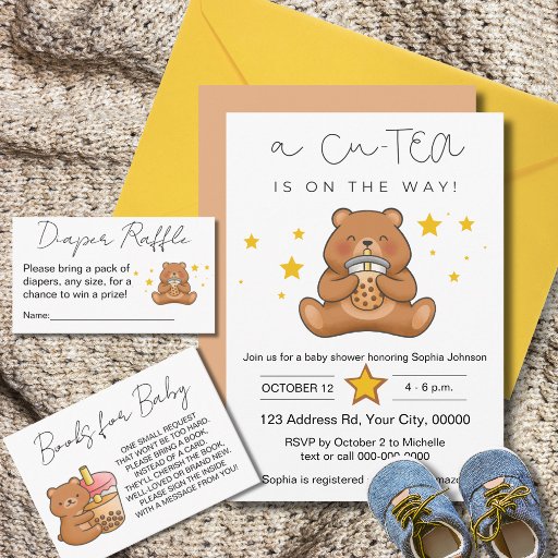 Um "Cu-TEA" está a caminho! Este convite para chás de fraldas neutro em termos de gênero é o motivo para um evento espetacular. O tema apresenta um chá boba bebendo de ursinho giro em um design simples, mas elegantemente trabalhado. Use o modelo para personalizar seus detalhes. As estrelas do meio podem ser apagadas se preferirem amarelo ou castanho, ou manter como está! Agora faça o chá começar e deixe a diversão começar.