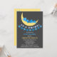 © Designs socialitas. Urso azul bonito dormindo no convite do chá de fraldas gêmeo da lua. A design também tem uma faixa estelar e o texto "São Gêmeos!". A parte de trás do convite tem um fundo amarelo com estrelas de grande porte. Todos os elementos de design podem ser movidos, redimensionados ou excluídos para se adequarem ao seu evento.
