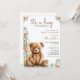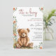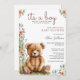 Chá de fraldas de aquarelas bonitinho com ursinho de peluche sentado em flores silvestres. Um convite à aquarela que proclama, é um menino, e podemos esperar que ele chegue.