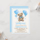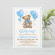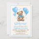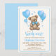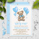 Uma brincadeira divertida com estas palavras podemos "esperar muito!" convites para o chá de bebê. Apresentando um doce ursinho com um arco azul, balões em forma de coração azul e corações azuis.