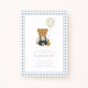 Celebre a chegada do seu garotinho com este charmoso convite de chá de fraldas de ursinho de pelúcia azul-claro. Apresentando um doce ursinho marrom segurando um balão e vestido em macacões, este adorável design dá o tom perfeito para uma celebração acolhedora e sincera. O fundo de gingham azul suave adiciona um toque clássico e eterno — perfeito para chás de fraldas ou encontros temáticos com ursos de pelúcia. Personalize com o nome da futura mãe e os detalhes do chá. Quer você esteja planejando um chá tradicional ou um evento bonitinho no estilo da floresta, este convite combina lindamente com qualquer berçário de gingham ou tema animal mole. Os hóspedes amarão e apreciarão!