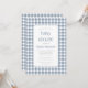 Este convite para o chá de fraldas apresenta um fundo azul e branco rústico e empoeirado de gingham. O texto aparece num retângulo branco com uma fina borda azul empoeirada e cantos arredondados, com as palavras "chá de fraldas" e o nome da futura mãe na charmosa tipografia azul empoeirada e o texto restante na letra serif cinza. Ideal para o chá de fraldas de um menino ou de uma menina. O padrão de gingham é repetido na parte de trás do cartão.