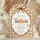 Um design acolchoado de chá de fraldas de floresta envolto no calor do outono. Apresentando animais de floresta desenhados à mão, um toco de árvore rústica, folhas caídas e borboletas moles, este layout é enquadrado em uma borda de fita redimensionada com um fundo bege quente de gingham. Ideal para chás de outono ou temas florestais neutros que celebram uma mama-a-ser com amor e charme da natureza.