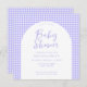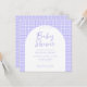 Crie seu próprio convite personalizado de chá de fraldas com design simples e mínimo design e padrão de xadrez roxo.