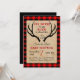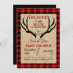Fundo de xadrez de Buffalo com papel rústico. Grandes traficantes de cerco rodeiam as palavras "Oh, Deer a Little BUCK está quase aqui". Personalize com os detalhes do seu partido.