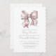 Este charmoso convite para chás de fraldas apresenta um arco rosa pálido e pálido, cor-de-rosa, com uma borda escaldada, para um toque extra de beleza. A design mostra uma aparência simples e clássica de chá de fraldas com texto de cinza numa mistura de serifa e tipografia de script de caligrafia. Celebrar a futura mãe no estilo! Você pode personalizar as cores da fonte e do plano de fundo em ambos os lados. Ideal para chás de fraldas do ano inteiro, especialmente para uma festa de jardim ou brunch. Fácil de decorar com fitas e arcos cor-de-rosa ou outros temas. Convite de Chá de fraldas Simples de Cor d'Água Cor Rosa de Arco Scallop com Tipografia de Script Elegante. Disponível como um convite impresso ou como um convite digital para download que você pode enviar por e-mail ou que foi impresso localmente!