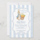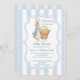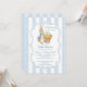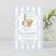 Peter rabbit com uma jaqueta azul e legumes de jardim chá de fraldas convite para modelo digital instantâneo. Um belo coelho numa jaqueta azul no jardim vegetariano para um bebê chá de fraldas pastel azul vintage listrado fundo