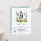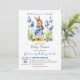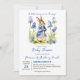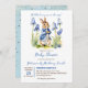 Peter Coelho com uma jaqueta azul azul azul flores azuis chá de fraldas modelo convite para download instantâneo digital. Um belo coelhinho numa jaqueta azul em um jardim azul de campanhe para um chá de fraldas bebê