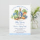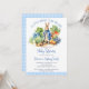 Peter rabbit com uma jaqueta azul e legumes de jardim chá de fraldas convite para modelo digital instantâneo. Um belo coelho numa jaqueta azul no jardim vegetariano para um bebê chá de fraldas pastel azul gingham