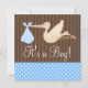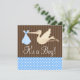Um convite para chá de fraldas de um garoto azul e marrom. Apresentando um carregando de cegonha um pacote azul. Tendência e moderno — Personalize facilmente seu chá de fraldas!