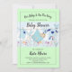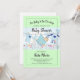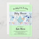 Um convite de chá de fraldas cômico com um feixe ilustrado de bebês em uma linha de roupas com roupas de bebê, flores e um monte de flores silvestres em um fundo verde alegre de menta. Personalize o seu chá. Um estilo neutro em termos de gênero.