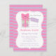 Esse convite de festas elegante, chique e clássico de chá de chá de fraldas é perfeito para convidar a mãe a ir a uma festa de chá de uma tarde confortável e relaxante com um grupo de amigos íntimos. O convite cor-de-rosa e roxo tem um macarão de 3 yummy, roxo, menta e rosa, embalado em uma embalagem agradável com fita cor-de-rosa e uma etiqueta de presente que diz "chá de fraldas". Padrão de listras rosa e roxo para fundo. A confecção francesa e a paleta colorida somam a elegância. Personalize facilmente com os detalhes da festa.