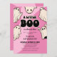Bonita convidada para um chuveiro de bebês, de halloween, com um fundo cor-de-rosa, um grupo de fantasmas retrorreflectores, a diversão dizendo que "um pequeno boo está quase a ser esperado", e um modelo de texto moderno que é fácil de personalizar, seus convidados estarão morrendo para colocar as mãos nesses convites!