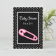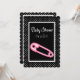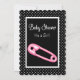 Um rosa e preto giro é um convite de chá de fraldas feminino com bolinhas na moda preto e branco e um pino de fralda rosado giro. Personalize adicionando o nome da mamãe a ser e os detalhes da festa da menina. ©PartyPlanos