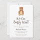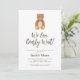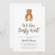 Este convite para chás de fraldas é decorado com um ursinho de pelúcia pintado à mão. O texto castanho diz: "Podemos esperar muito!" Este convite é excelente de um chá de fraldas neutro em termos de gênero. Original Watercolor © Michele Davies.