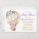 Urso de Teddy com Balão de Ar Quente Quente, Violeta-Púrpura, Violeta-Cor-de-Água, com Convite para Chá de fraldas de Arco Roxo. Inclui belos rosas de cor d'água púrpura, flores brancas e verde botânico. Texto Dourado e Roxo.