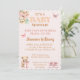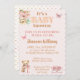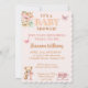 Este convite para o precioso apresenta um adorável ursinho de pelúcia no canto segurando um presente. Pequenos calçados, flores e borboletas também adoram o convite, que é colocado contra um fundo rosa claro. O lado inverso tem um padrão cardíaco feito em dois tons de rosa. Atualize o convite com todas as suas informações com o modelo fácil de usar fornecido. Muitos outros produtos correspondentes no nosso compro também!