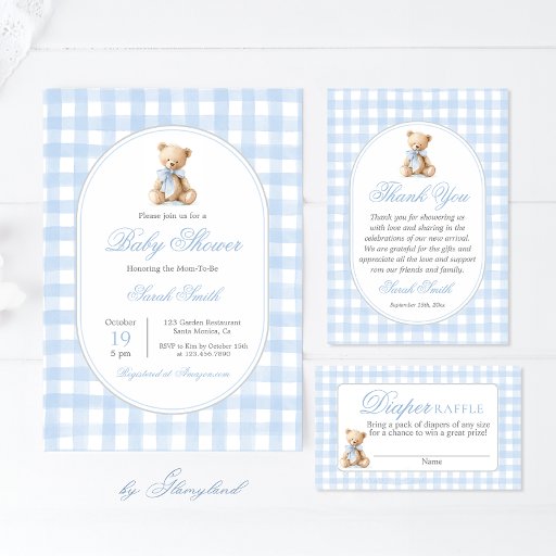 Convite Blue Gingham Bear Chá de fraldas Boy
