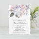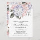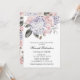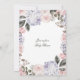 Estes convites simples e bonitos do chá de fraldas caracterizam um buquê de flores bonito da aguarela em um fundo branco limpo. Há hydrangeas roxos coloridos silenciado, cora peônias e rosas cor-de-rosa, e obscuridade - folha e as folhas cinzentas. Uma mistura de texto moderno do serif e de tipografia elegante do roteiro adiciona o estilo clássico. A parte traseira do convite tem um quadro floral de harmonização bonito.