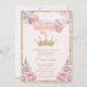 Este convite de chá de fraldas personalizado apresenta um tema da princesa de conto de fadas para uma menina em um fundo cor-de-rosa macio. Uma imagem de uma pequena princesa reluzente dourada tiara é ilustrada abaixo de um cartaz caprichoso que diz, "é uma menina". Um quadro reluzente dourado borda o convite, com rosas cor-de-rosa e buquês respiratórios para bebês impressos nos cantos superior esquerdo e inferior direito.