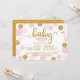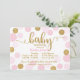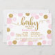Dourados pontos brilhantes e design de convite para chás de fraldas moderno de pontos polka dispersos cor-de-rosa.