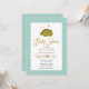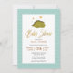 Dourado Convite ao Chá de fraldas de Script Dinossauro Verde - Comemore a chegada do seu bebê precioso com este adorável e fofo 'Convite ao Chá de fraldas', com um dinossauro adormecido verde sob as estrelas no topo. O título apresenta uma folha de ouro como a caligrafia. O plano de fundo apresenta um padrão de seta turquesa. Todos os textos estão pré-organizados para que você personalize fácil e rapidamente com os detalhes do seu chá de fraldas.