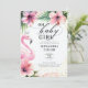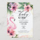 Uma doce ilustração aquosa de um flamingo cor-de-rosa, com uma tiara na cabeça e rodeada por folhas tropicais exuberantes em cor-de-rosa arranjadas em uma armação, com um confete dourado (isto é um efeito digital, não uma folha real) é a peça central deste adorável convite para chás de fraldas de menina que é perfeito para os meses de verão para uma mãe ser que ama o tema do chá de fraldas flamingo. Afirmação, ousadas flores de hibisco acrescentam ao tema tropical e à caligrafia moderna a elegância e a vibe feminina. Moderno e moderno.