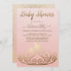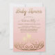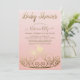 Fundo de aquarela cor-de-rosa com trabalho de arte de princesa dourada. Cabeçalho de chá de fraldas e convidado de honra na fonte ouro do estilo script de escrita manual. O lado inverso é o gradiente cor-de-água rosa com bordas de efeito de brilho dourado (não a brilho real).