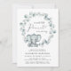 Um convite para chás de fraldas bonitinho, neutro em termos de gênero, que apresenta "A Sweet Little Peanut Is On Your Way" na tipografia moderna e um guião de na moda com um inchaço cardíaco, e uma ilustração com aquarelas de um elefante bebê verde em forma de horta pastel, numa coroa de verde-sábio eucalipto verde-verde.