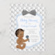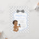Arco convite para chá de fraldas de gravata de menino com adorável hispânico, índio, afro-americano, bebê étnico vestindo fralda e segurando um chocalho em um lindo fundo de diamante azul-bebê tufado com fundo de gravata de arco de prata. Este adorável convite para chás de fraldas e azuis bebê é facilmente personalizado para o seu evento simplesmente adicionando os seus detalhes no estilo de letra e na redação da sua escolha. Este é um design impresso sem gravata de arco real, diamantes, tufagem, brilho, etc.