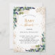 Bem-vindo a um Chá de fraldas elegante. Um fundo branco chic. Decorados com folhas de eucalipto, prigos, verde, folhas de ouro falso e pó de ouro, de cor aquosa verde. Personalize e adicione o nome da mãe a ser e os detalhes da parte. Letras pretas e ouros.