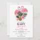 O convite para chás de fraldas apresenta flamingos cor-de-rosa e abacaxi.