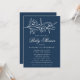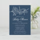 Convites florais elegantes para bebês com flores brancas esboçadas e folhas perto do topo do convite com fundo de marinho. Personalize o convite de chá de fraldas botânico com o nome da mãe e os detalhes do chá abaixo em caracteres brancos clássicos.