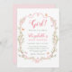 Este convite de chá de fraldas para meninas apresenta um quadro floral cor-de-rosa e verde, enfeitado com borboletas e fitas.