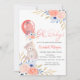 O convite para chá de fraldas bonito apresenta ursinho de pelúcia e balão com chá de fraldas de flores. Esses convites para chuveiros de bebês são facilmente personalizados para seu evento simplesmente adicionando seus detalhes.