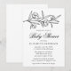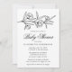 Convites florais elegantes para bebês com flores pretas esboçadas e folhas perto do topo do convite com fundo branco. Personalize o convite de chá de fraldas botânico com o nome da mãe e os detalhes do chá abaixo em letras negras clássicas.