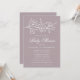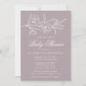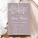 Convites florais elegantes para bebês com flores brancas esboçadas e folhas perto do topo do convite com um fundo roxo empoeirado. Personalize o convite de chá de fraldas botânico com o nome da mãe e os detalhes do chá abaixo em caracteres brancos clássicos.