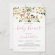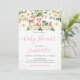 Este convite apresenta animais lindos de floresta com flores cor-de-rosa pinceladas e sotaques falsos de folhas de ouro.
