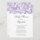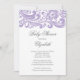 Parta seu chá de fraldas do bebé fora do direito com nossos lilac na moda & elegante da lavanda & convite floral branco do chá de fraldas do redemoinho do damasco ajustados em um fundo branco torrado. Apenas personalize nosso convite elegante com sua informação do chá de fraldas e você é todo ajusta-se para ir. Disponível em outras combinações de cor à moda do bebê em nossa loja em www.celebrateitinvites.com. Verificação para fora nosso obrigado de harmonização você notas, etiquetas e botões nupciais em nossa loja