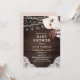 O convite para chá de fraldas ruidoso de Boho apresenta flores brancas e brancas e folhas de palma secas em fundo de madeira.