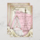Vintage convite para o chá de fraldas de Paris com bassinet e Torre Eiffel em um belo fundo de vintage com espirais de ouro. Você pode personalizar facilmente este chá de fraldas de Paris para o seu evento adicionando seus detalhes no estilo de fonte e na cor e no texto de sua escolha.