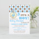 Um convite de chá de fraldas com uma borda superior de argyle azul e castanho com tom azul. Pino de fralda azul conectado à borda superior e forma circular com dentro de carruagem azul para bebês. Personalize o texto azul e marrom com detalhes da sua ocasião.