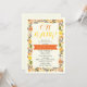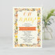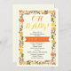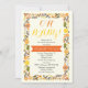 Oh Chá de fraldas, laranja e amarelo, convite na fronteira floral, com a frase "Oh baby" em laranja e amarelo, uma ilustração de uma fronteira floral feita de bonito flores silvestres e folhas verdes de azeitona em fundo de marfim. Texto em preto e branco em uma faixa laranja.