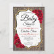 Convite para chás de fraldas. Design russo com padrão de madeira e ouro brilhante falso. Possui fonte de script de tendência, rosa vermelha e confetti. Perfeito para um chá de fraldas neutro em na moda.