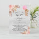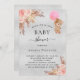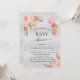 Para um chá de fraldas moderno estilo boho. Um fundo de olhar mal prateado. Decorado com ouro rosa e flores cor-de-rosa, rosas, grama-pampas e ursinha-peluche segurando um balão rosa. Personalize e adicione um nome e detalhes da parte.