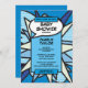 Um divertido, legal e moderno livro de histórias em quadrinhos azul de um bebê inspirado em chás de fraldas, borrifados ou casais, convite para o chá que coloca o wham, zap, pow em qualquer mãe super-herói para ser ou evento de celebração de casais. O reverso apresenta um padrão de bolinhas de quadrinhos azuis correspondente que você pode substituir por sua própria imagem ou foto. Projetado por Thisnotme©