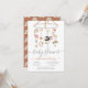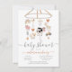 Convites modernos e fofos para bebês de animais de fazenda. Scandinávia excelente com uma vaca, carneiro, porco, galo, cabra, rastreador, arco-íris, nuvens e estrelas penduradas num celular. Esquema de cor neutro para ser um menino ou uma menina. Terra cotta, cinza azul empoeirada e branca.